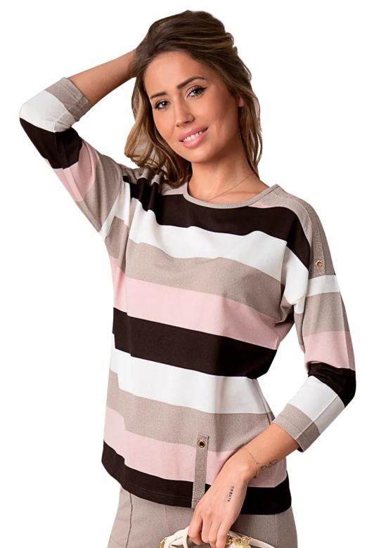 Dámská halenka 1068/40 značky HAJDAN představuje spojení elegance a pohodlí, které ocení každá žena s citem pro styl. Jemné horizontální pruhy v odstínech růžové, béžové a hnědé vytvářejí svěží vzhled, který zaujme na první pohled. Lehký materiál s podílem viskózy příjemně obepíná postavu a nabízí volnost pohybu i při celodenním nošení. Kulatý výstřih působí decentně, zatímco tříčtvrteční rukávy se zakončením v jednobarevném provedení dodávají modelu moderní nádech. Malé ozdobné prvky po stranách nenápad…