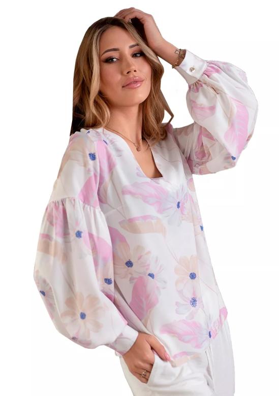 Dámská halenka 1219_01 HAJDAN vyniká elegantním véčkovým výstřihem, který podtrhne ženský dekolt. Rukávy jsou dlouhé, volně splývavé a zakončené manžetou s knoflíkem, což přidává modelu na stylovosti a pohodlí. Halenka je vyrobena ze 100% polyesteru, konkrétně z velmi příjemného mikrovlákna, které zajišťuje lehkost a příjemný pocit na pokožce po celý den.Design se vzorem květin v pastelových barvách dodává halence jemnost a svěžest, přičemž absence krajky zachovává její čistý a moderní vzhled.Tento model…