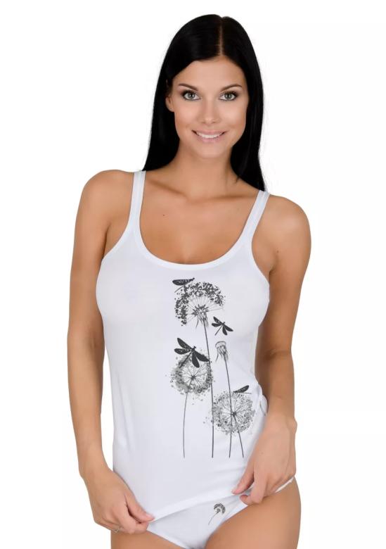Dámská košilka s kulatým výstřihem a úzkými ramínky z kolekce FOREVER YOUNG nabízí pohodlný a moderní vzhled. Design košilky zdobí jemný obrázek pampelišky a vzezření podtrhuje decentní absence krajky. Materiál je složen z 94 % bavlny a 6 % lycry, což zajišťuje příjemný pocit na pokožce a zároveň spolehlivou pružnost. Pevná ramínka drží košilku na svém místě bez zbytečného sklouzávání. Tato lehká a vzdušná dámská košilka 52/1-30/2+D233 FABIO je skvělou volbou pro volný čas i spodní vrstvu během letních…