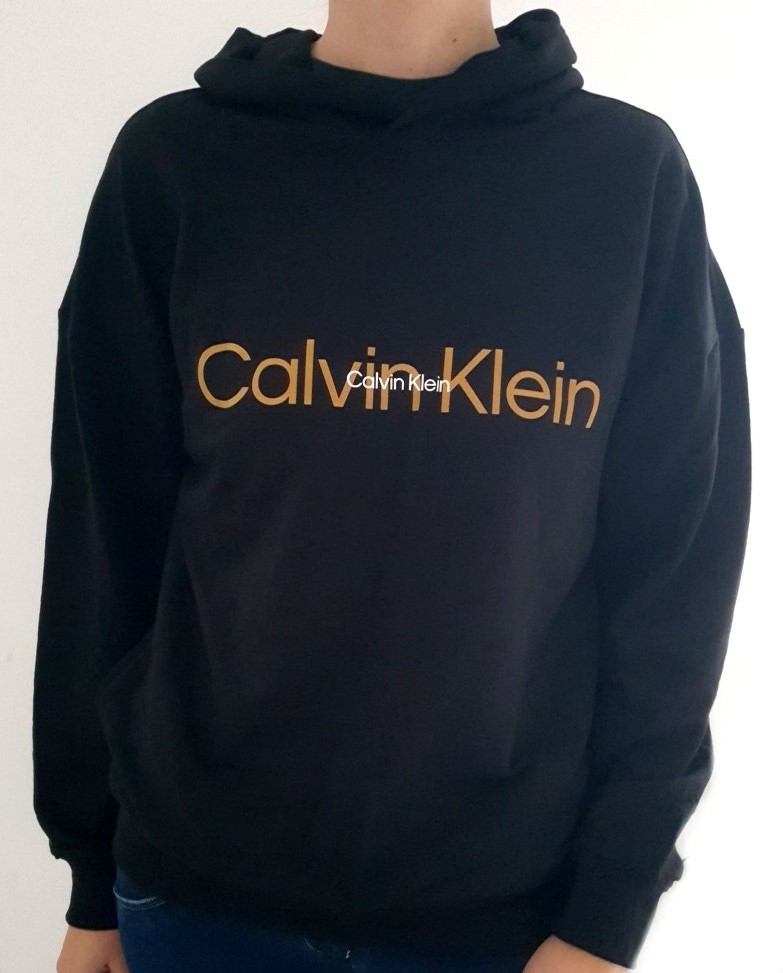 Mikina je s kapucí a vpředu je zlatý nápis Calvin Klein.