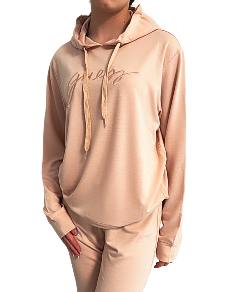 Mikina je přes hlavu a má kapuci, vpředu je elegantní vyšitý nápis značky Guess.