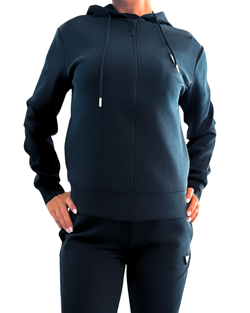 Dámská mikina je rozepínací, má kapuci a na levé části menší trojúhelníček se znakem Guess.