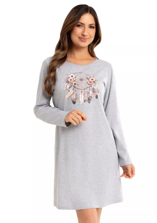 Dámská noční košile 162/52 značky REGINA je ztělesněním pohodlí a jemné elegance pro každou ženu, která si přeje relaxovat v příjemném domácím prostředí. Měkký materiál ze 100% bavlny Vás zahalí do lehkosti a zajistí maximální komfort během spánku i odpočinku. Světle šedý odstín působí klidně, zatímco originální potisk s motivem lapače snů dodává košili osobitost i hravost. Volnější střih sahající nad kolena neomezuje pohyb, dlouhé rukávy poskytují hřejivou ochranu v chladnějších večerech a kulatý výstři…