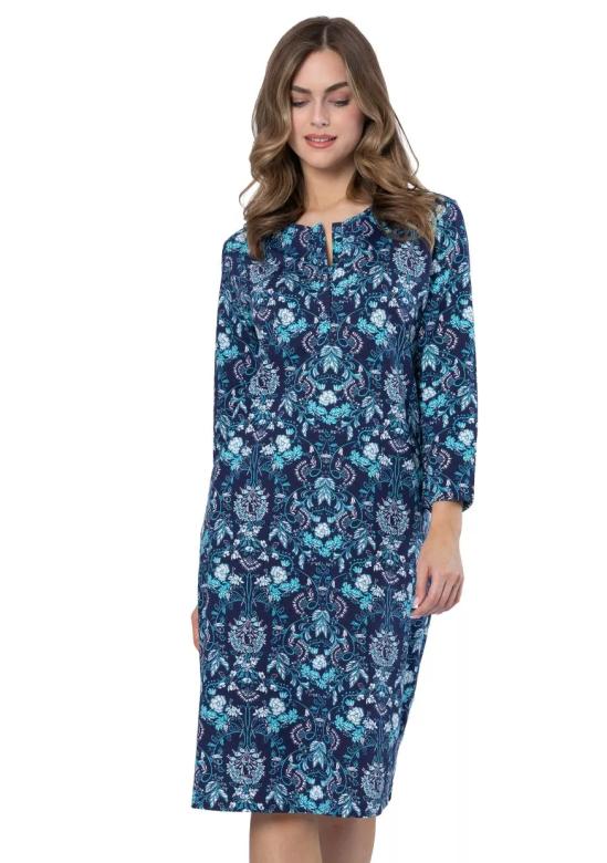 Dámská noční košile Arleta 1653 značky LEVEZA nabízí skvělý komfort a příjemný pocit díky kvalitnímu materiálu z 100% bavlny. Tento model s dlouhým rukávem je ideální volbou pro chladnější noci, kdy oceníte měkkost a prodyšnost přírodních vláken. Elegantní modrý vzor dodává noční košili stylový a zároveň nenásilný vzhled, který zaujme ženy hledající pohodlné, ale přitom estetické oblečení na spaní.