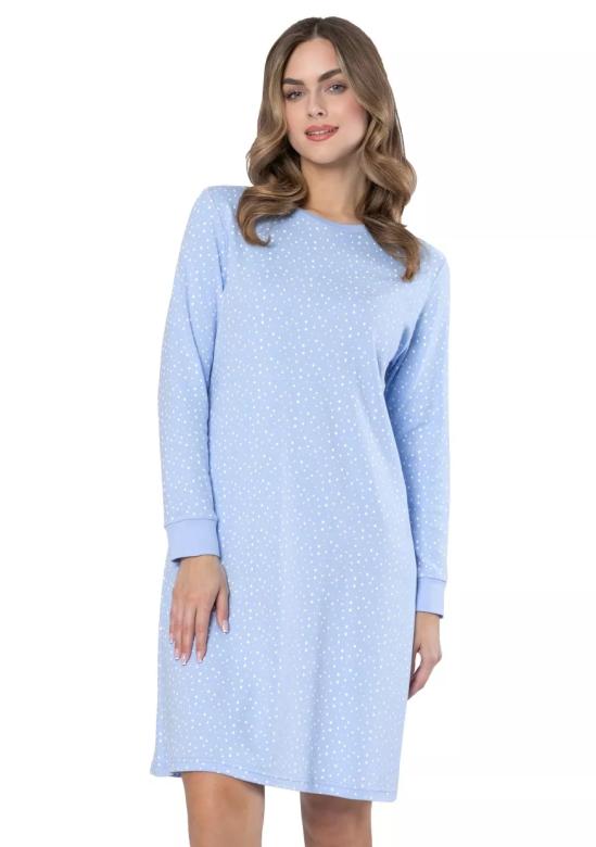 Dámská noční košile Kryspina 1659 značky LEVEZA nabízí ideální kombinaci pohodlí a jemného designu pro každou ženu. Tato světle modrá košile je zdobená drobnými bílými puntíky, které dodávají hravý a přitom nenucený vzhled. Volný střih zajišťuje maximální komfort během spánku i relaxace doma, zatímco dlouhé rukávy s jemnými manžetami ochrání před chladem. Kulatý výstřih jen podtrhuje její jednoduchou eleganci, která se hodí do každého šatníku.
