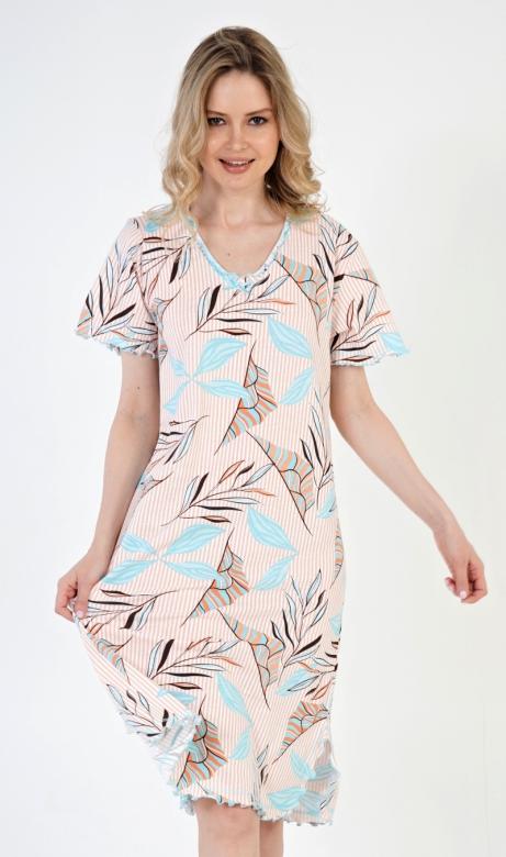 Noční košile je s krátkým rukávem zdobena jemným vzorem lístků a lemováním volánky.