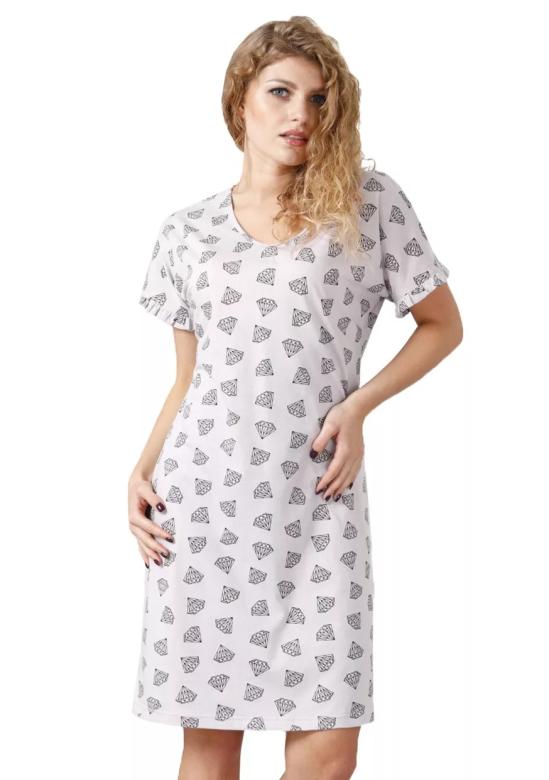 Dámská noční košile Zarta 1034 LEVEZA je pohodlný kousek vhodný nejen na spaní, ale i pro relaxaci doma. Košile s krátkým rukávem je zdobená jemným vzorem diamantů, který přidává na stylovosti a vkusném designu. Díky jednoduchému střihu a kulatému výstřihu je ideální volbou pro každou ženu, která hledá pohodlí bez zbytečných ozdob.