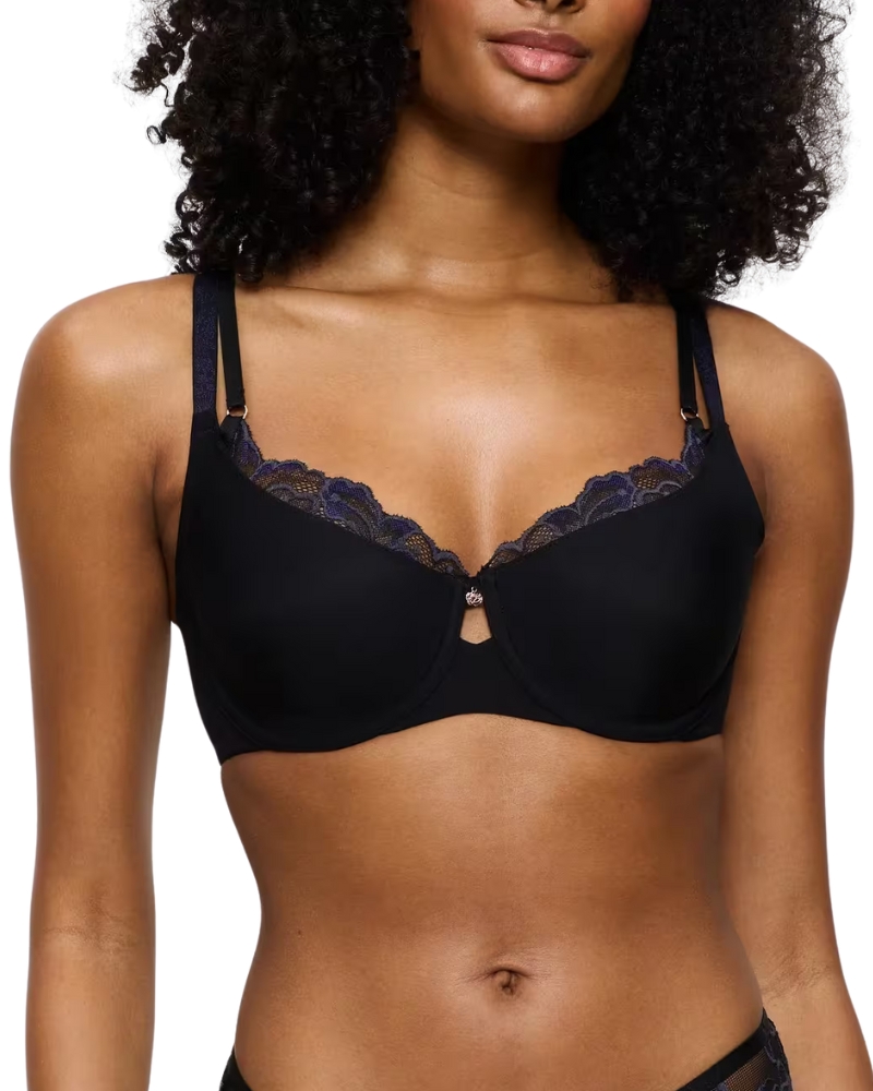 Vyšší střed u podprsenky zajistí perfektní držení prsou a krajka ve výstřihu je důmyslně střižena a přechází vpředu efektně do druhého ramínka.
