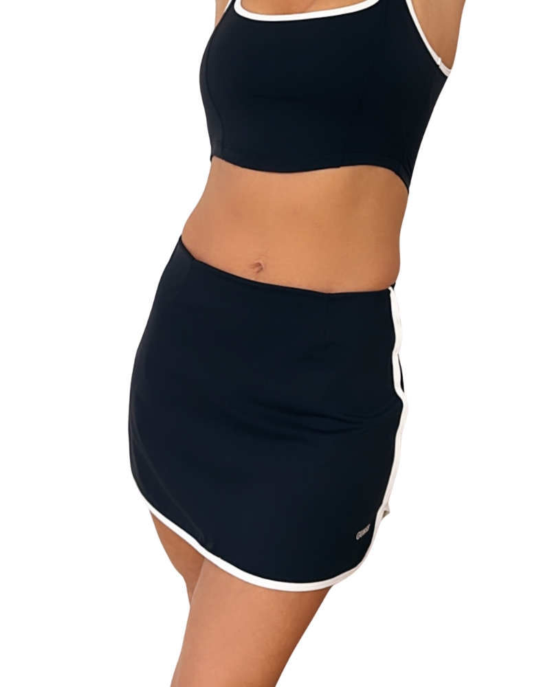 Dámské kraťasy v černé barvě, které jsou překryty sukní a doplněny o bílé lemování.