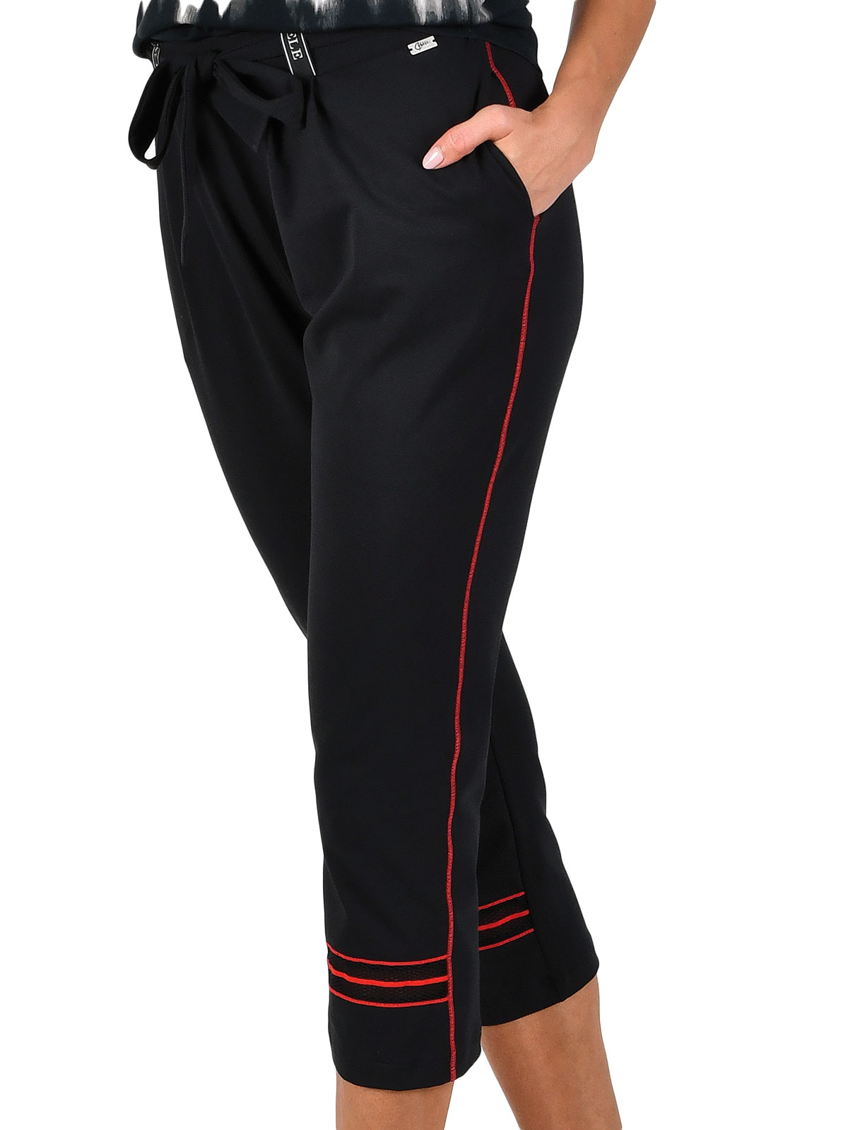 Dámské kalhoty jsou v černé barvě s červenými detaily velmi pohodlný.