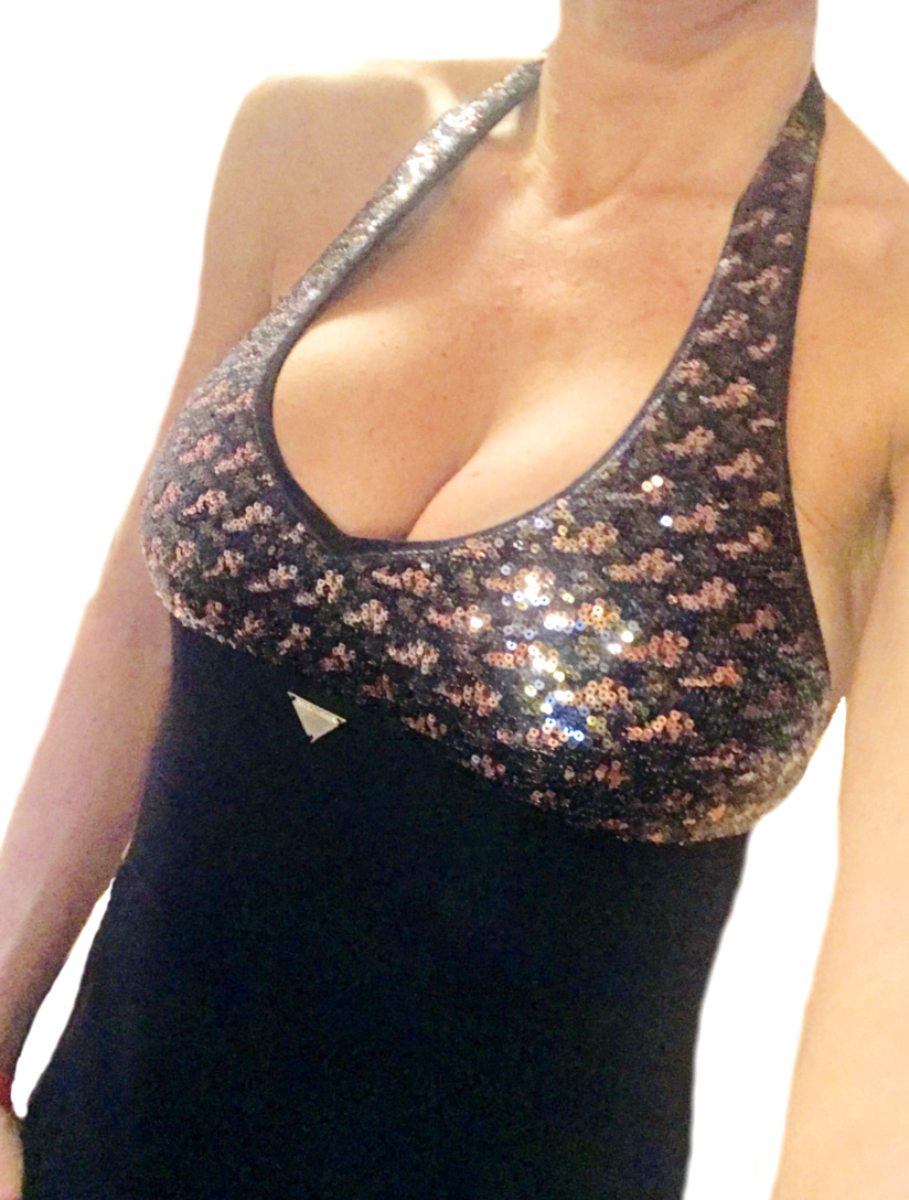 Dámské šaty mají nevyztužené košíčky zdobeny černo-bronzovými flitry, které dodávají na eleganci.