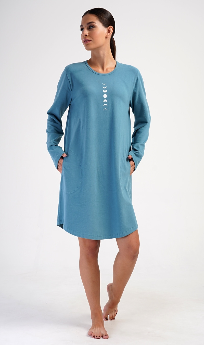 Šaty či noční košile s kulatým výstřihem a jemným motivem mají kapsy po bocích.