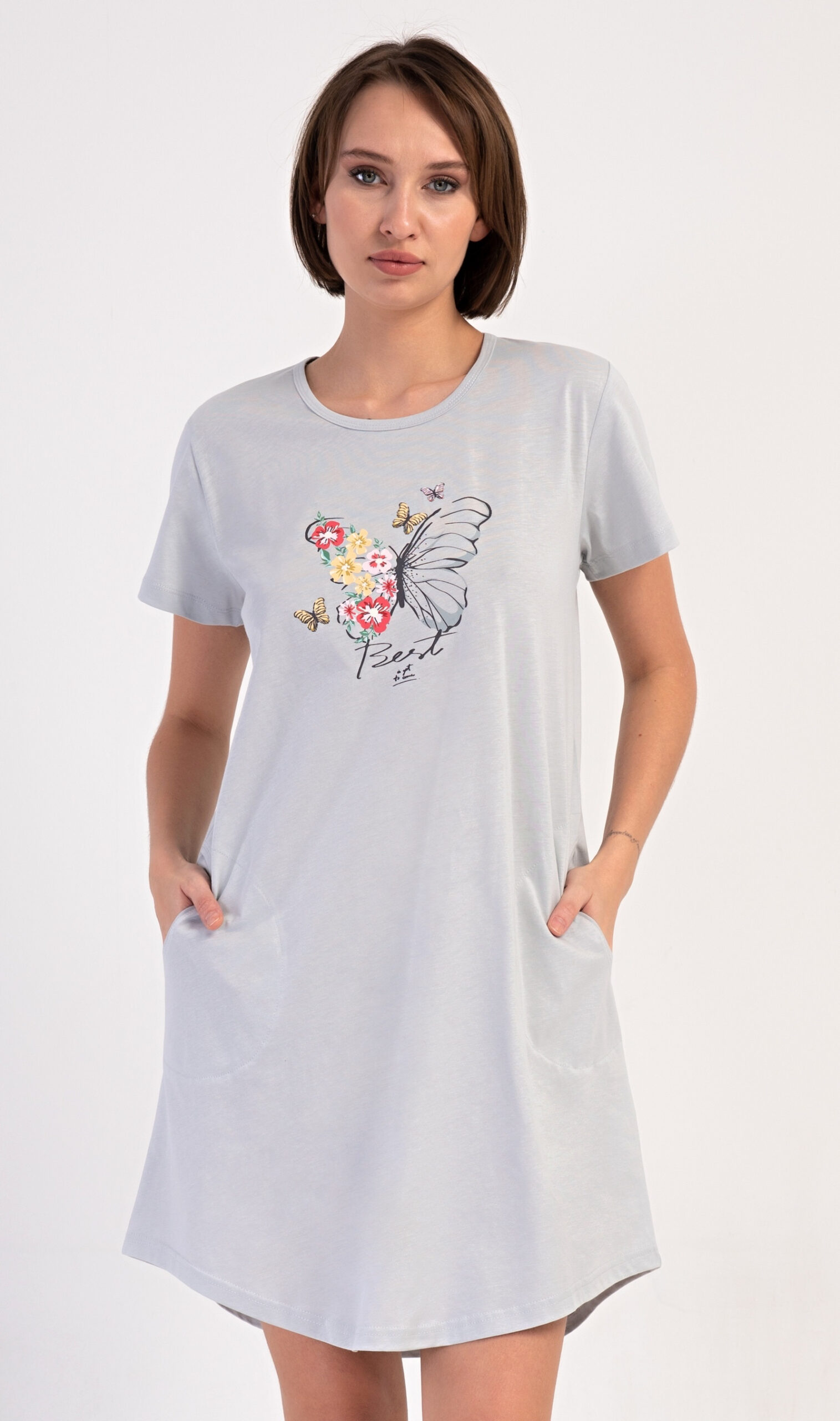 Domácí jednobarevné šaty s kulatým výstřihem a kapsami zdobí na hrudi obrázek motýla a květů. Použitý bavlněný materiál je příjemný a poddajný na dotek. Šaty jsou pohodlné, vhodné na spaní i na denní nošení.
