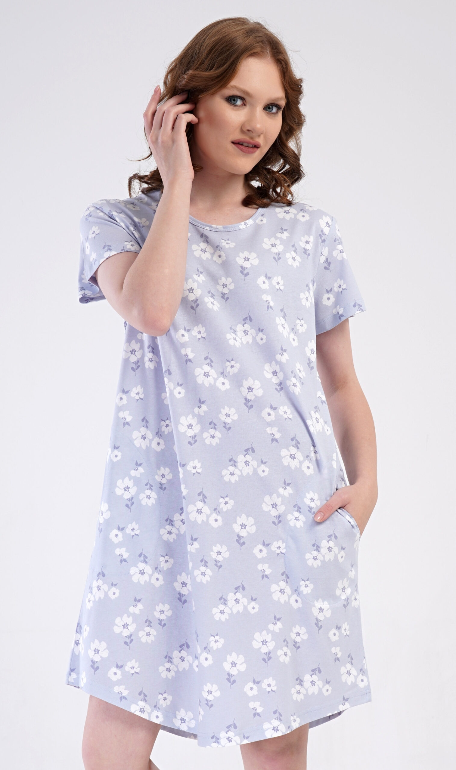 Domácí jednobarevné šaty s kulatým výstřihem a kapsami zdobí jemné bílé květy.