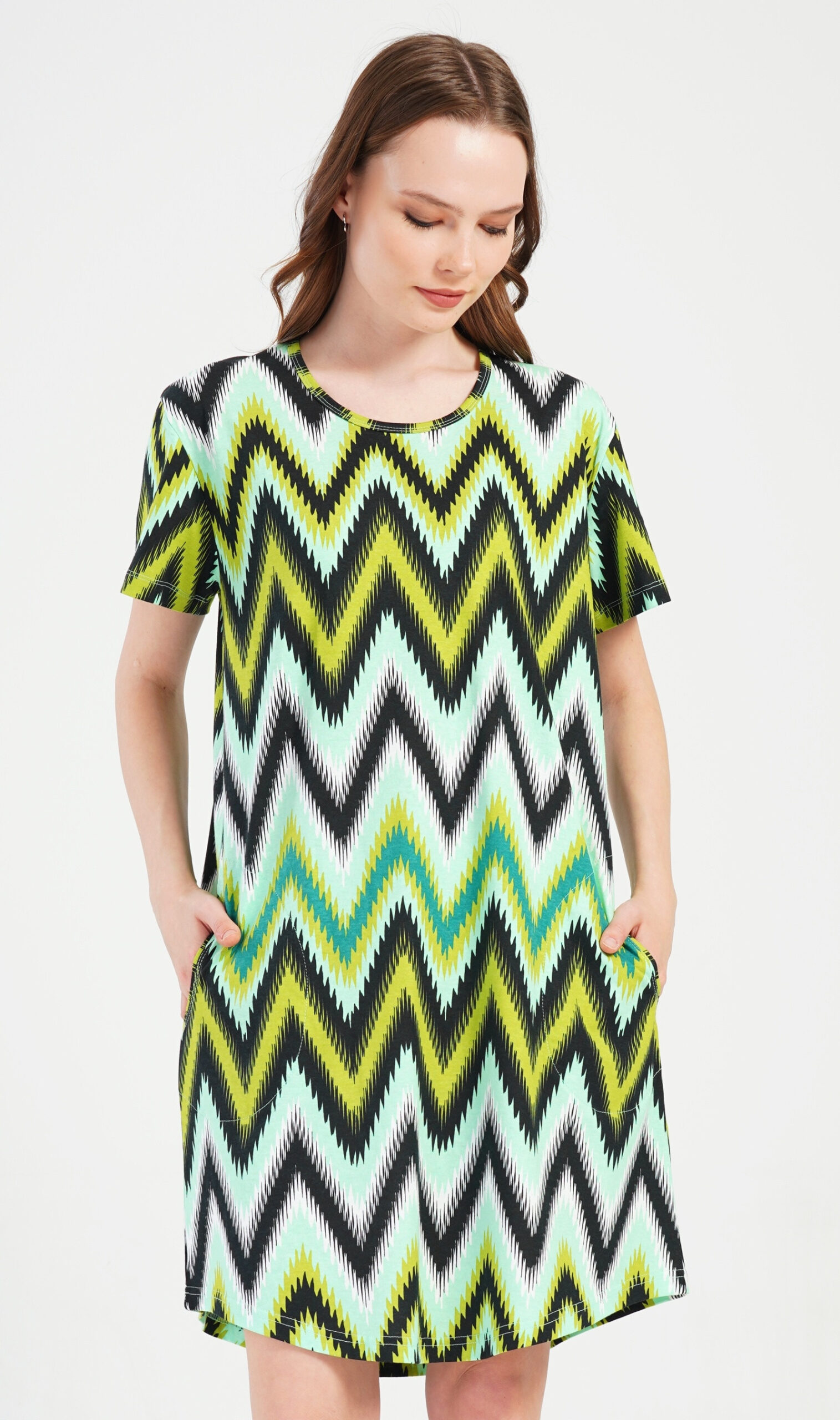 Domácí šaty s geometrickým zorem mají kulatý výstřih a praktické kapsy.