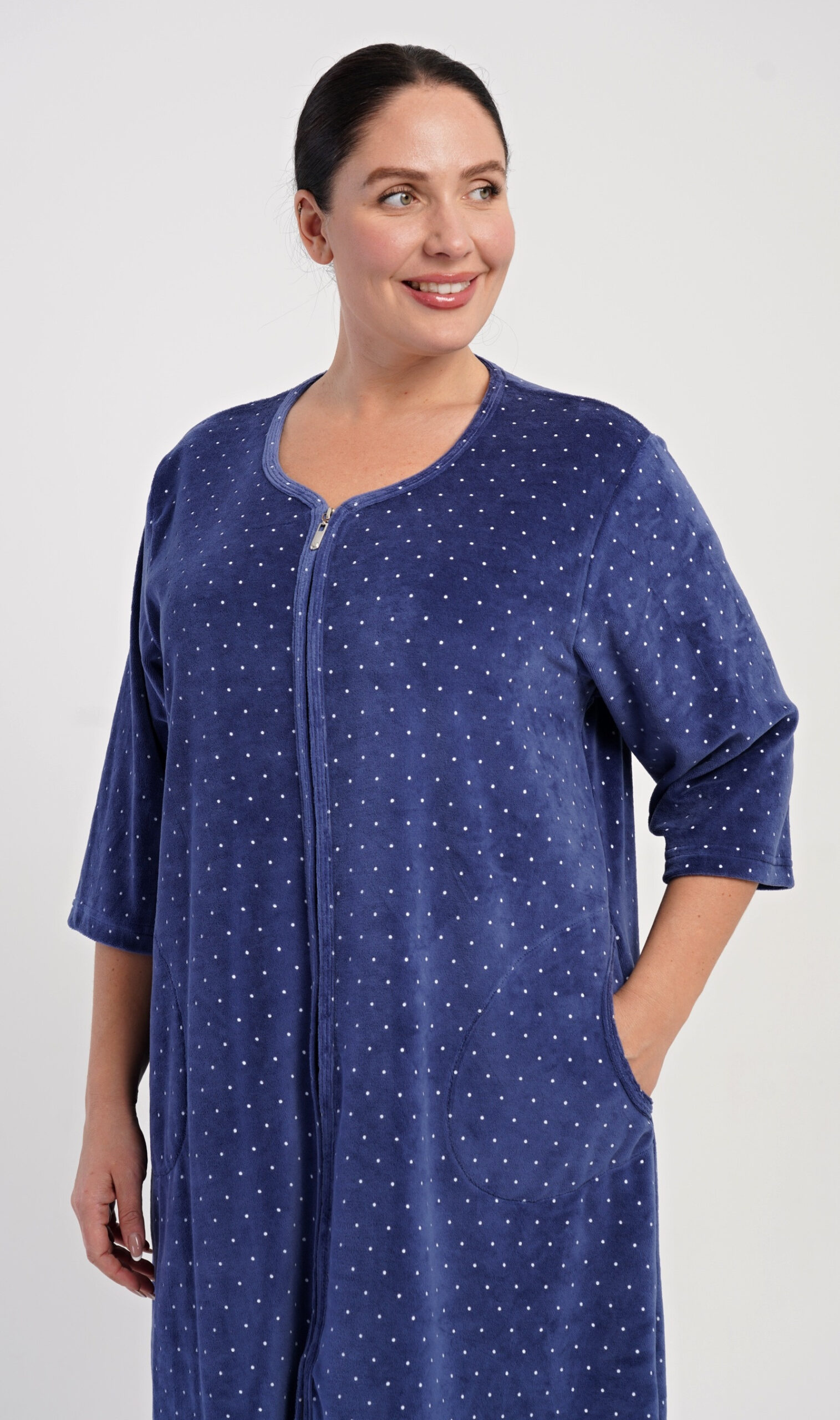 Dámské sametové domácí šaty s tříčtvrtečním rukávem Alex. Pohodlné rozepínací šaty v příjemné délce pod kolena využijete téměř při všech volnočasových aktivitách. Mají praktické kapsy a zapínání na zip. Použitý velurový materiál s obsahem bavlny 80% je příjemný a poddajný na dotek.