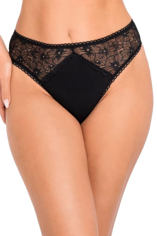 Kalhotky mají vyšší pas, jsou zdobeny efektní krajkou s květinovým motivem.