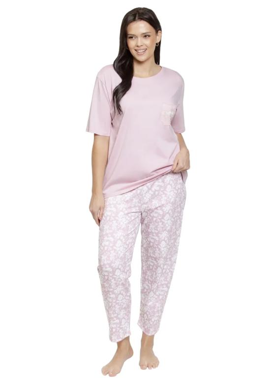 Dámské nadměrné pyžamo Adria 3568 značky TARO je ztělesněním pohodlí a elegance pro každou ženu, která si potrpí na kvalitní domácí oděv. Horní díl v jemném pastelově růžovém odstínu s krátkým rukávem a kulatým výstřihem působí vzdušně a uvolněně, zatímco malá kapsička na hrudi dodává decentní detail. Spodní díl tvoří dlouhé kalhoty s bílým květinovým vzorem na světle růžovém podkladu – tento kontrast vytváří příjemný ženský vzhled vhodný jak pro spánek, tak i chvíle domácí relaxace. Materiál ze 100% bav…