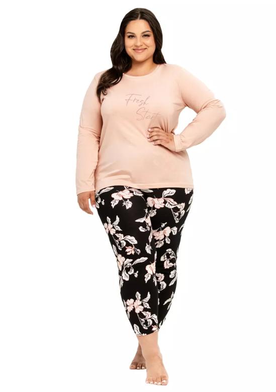 Dámské nadměrné pyžamo Katie 3255 TARO nabízí ideální spojení pohodlí a stylu pro ženy, které hledají kvalitní domácí oděv. Jemně růžový dlouhý rukáv s nápisem Fresh Start působí elegantně a zároveň uvolněně, zatímco černé legíny s výrazným květinovým vzorem v růžových a bílých tónech dodávají outfitu hravý a moderní nádech. Díky kulatému výstřihu se pyžamo příjemně nosí a nezpůsobuje žádné omezení během večerního odpočinku.