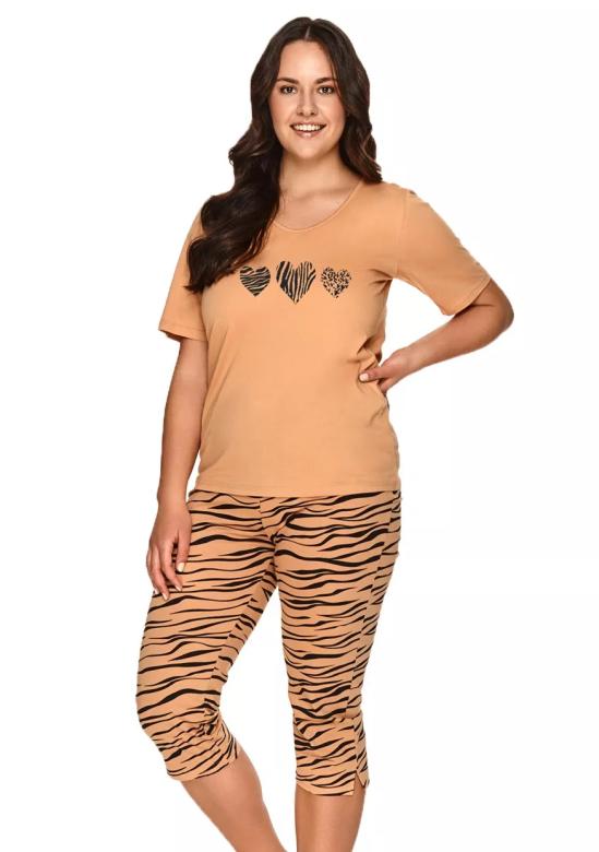 Dámské pyžamo Yelena 2696/1 TARO je ideální volbou pro pohodlné chvíle doma i na spaní. Tento nadměrný komplet obsahuje jednobarevné tričko s motivem tří srdcí a vzorované capri kalhoty, které díky elastickému pasu nabízí skvělý komfort a volnost pohybu. Tričko má kulatý výstřih a krátké rukávy, což zajišťuje příjemné nošení během teplejších dnů. Capri kalhoty jsou bez kapes a mají moderní vzor, který dodává celému setu svěží a originální vzhled. Materiálové složení tvoří ze 100 % bavlny, díky čemuž je p…