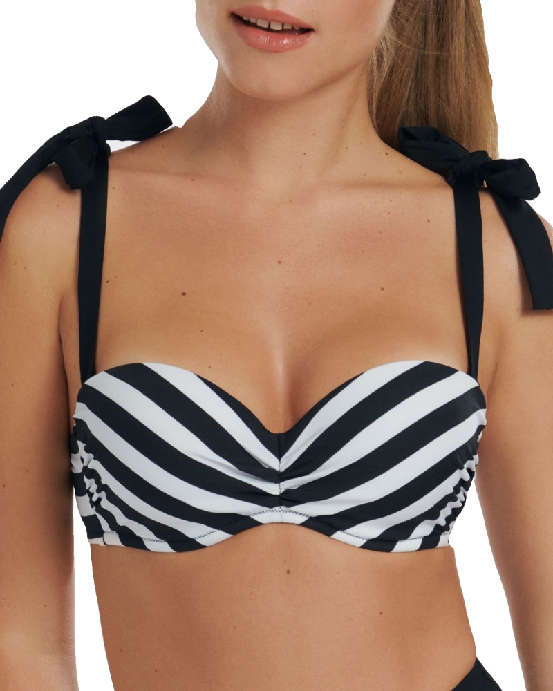 Korzetová plavková podprsenka má vyztužené tvarované košíčky (bez push-up výplní) zdobené řašením, plavky jsou v pruhovaném vzoru.