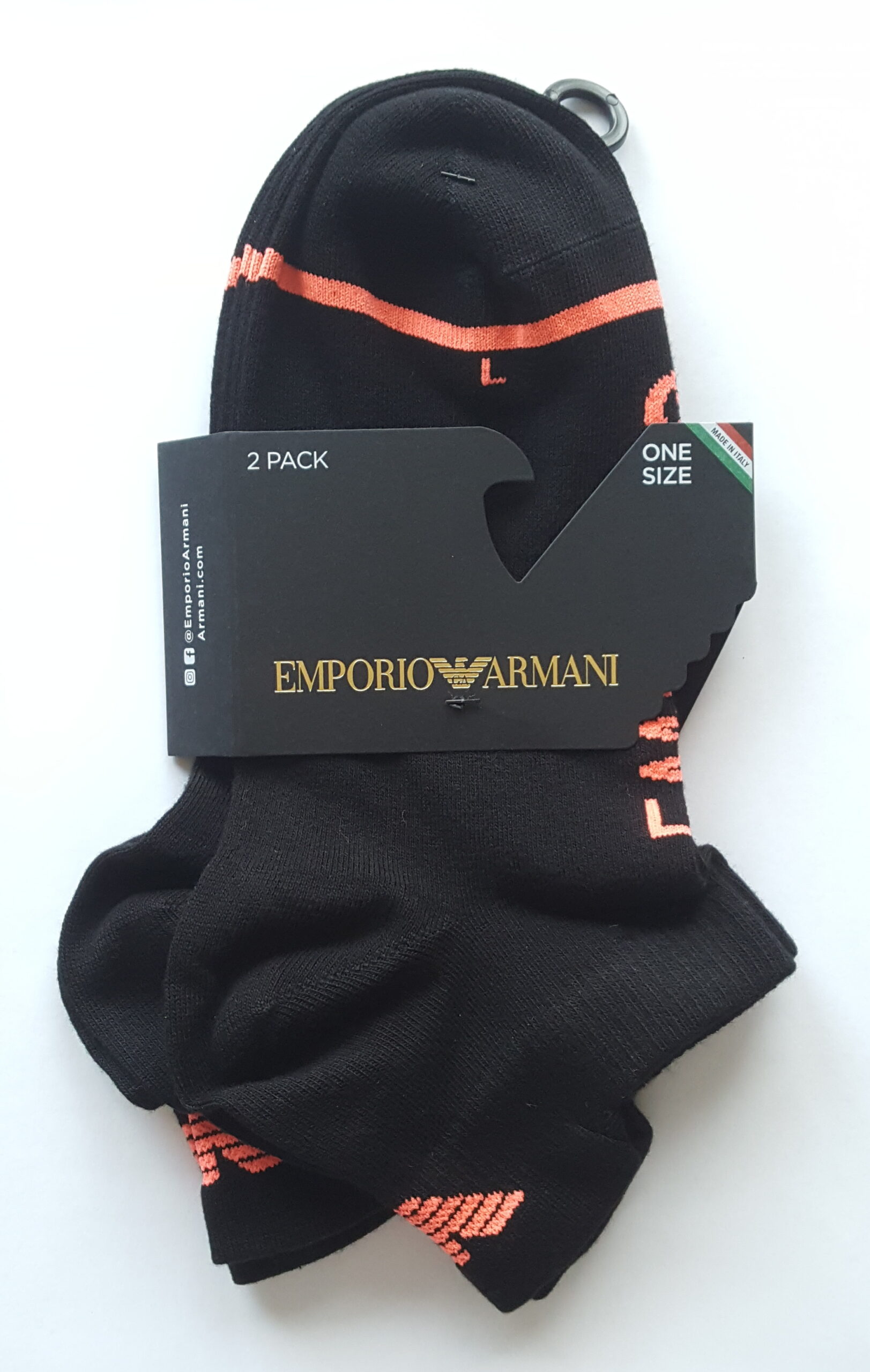 Ponožky jsou v horní části zdobeny nápisem značky Emporio Armani a logem vzadu na patě.