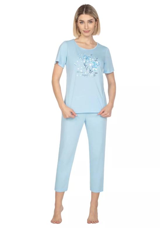 dámské pyžamo 655/42 REGINA je navrženo pro maximální pohodlí a styl během nočního odpočinku. Pyžamo se skládá z trička s kulatým výstřihem a krátkými rukávy, které zdobí jemný obrázek květin spolu s nápisem All I need is magic.
