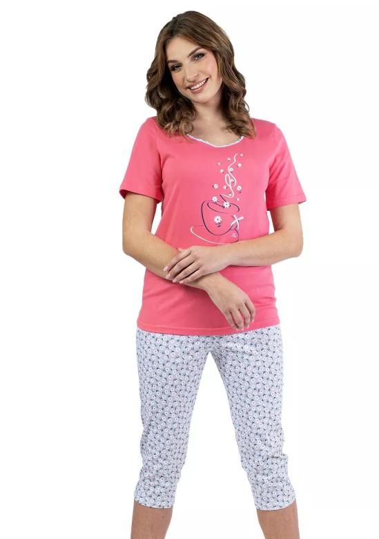 Objevte pohodlí a svěžest dámského pyžama 685/52 značky REGINA, které je ideální volbou pro klidné večery i relaxaci doma. Korálově růžový top s jemným motivem květinového šálku dodává šarm a radost každému dni. Výstřih kulatého střihu dokonale doplňuje jednoduchost a zároveň ženskost tohoto modelu.