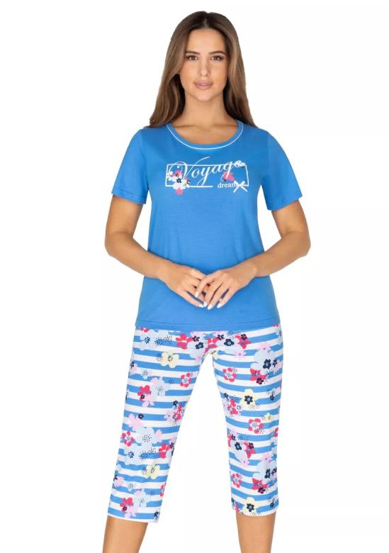 Dámské pyžamo 981 REGINA je ideální volbou pro pohodlné večery i domácí odpočinek. Skládá se z jednobarevného trička s krátkým rukávem, které zdobí jemný květinový motiv a nápis Voyage dream. Capri kalhoty s barevným květinovým vzorem a pruhy jsou navrženy bez kapes a disponují volnou gumou v pase pro maximální komfort.