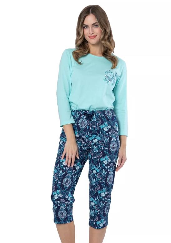 Dámské pyžamo Asteria 1651 značky LEVEZA je ideální volbou pro ženy, které oceňují komfort i styl ve svém každodenním nočním oblečení. Vrchní díl v jemné světle modré barvě je ozdoben decentním květinovým motivem u srdce a má pohodlné tříčtvrteční rukávy, které zaručují dostatek volnosti při pohybu.Kalhoty v tmavě modrém odstínu s bohatým květinovým vzorem dodávají celému modelu svěží a mladistvý vzhled. Elastický pas doplněný o stylovou mašličku perfektně sedí a zároveň nezatahuje, což přispívá k příjem…