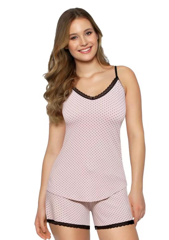 Dámské pyžamo Cleo růžová BABELLA představuje ideální volbu pro pohodlné noční chvíle i odpočinek po náročném dni. Tento model je tvořen jemnou košilkou na úzká, posuvná ramínka s decentním vzorem drobných puntíků, která doplňuje krajka decentně zdobící výstřih a lemování kraťasů. Součástí jsou i vzorované kraťasy, ušité bez kapes, s praktickou šňůrkou v pase pro individuální stažení dle potřeby. Materiál je měkká, vysoce příjemná viskóza, která garantiruje maximální pohodlí a prodyšnost během spánku.Typ…