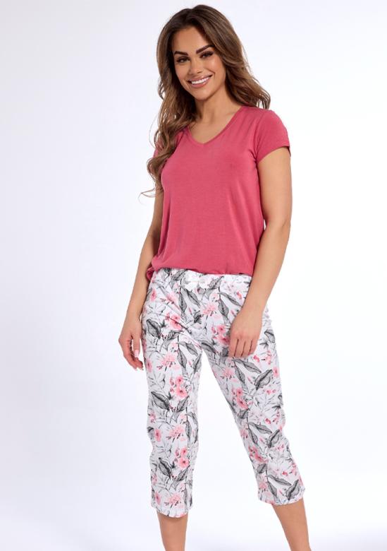 dámské pyžamo v sytě malinově růžové barvě je vyrobeno z luxusního, měkkého modalu, který příjemně obklopuje pokožku a zajišťuje maximální pohodlí. Tričko s krátkým rukávem a výstřihem ve tvaru písmene V působí elegantně a zároveň pohodlně. 7/8 kalhoty jsou zdobené jemným květinovým vzorem a v pase doplněné ozdobnou mašlí. Ideální volba pro teplé noci, pohodová rána nebo jako stylový doplněk domácího šatníku. Pyžamo je zabaleno v estetické dárkové krabičce, což z něj činí praktický a krásný dárek. Materi…