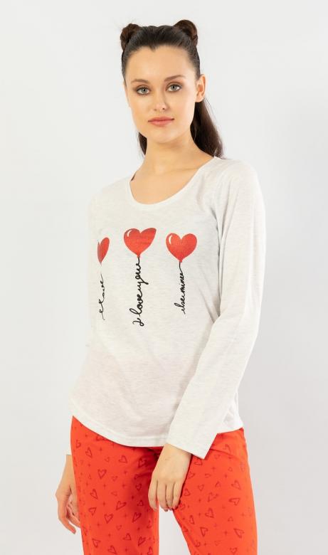 Dámské pyžamo se skládá z trika s dlouhými rukávy a motivem srdíček. Dlouhé kalhoty jsou rovněž potištěny drobnými srdíčky.