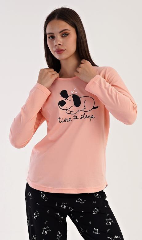 Dámské pyžamo tvoří triko s dlouhými rukávy a dlouhé kalhoty.