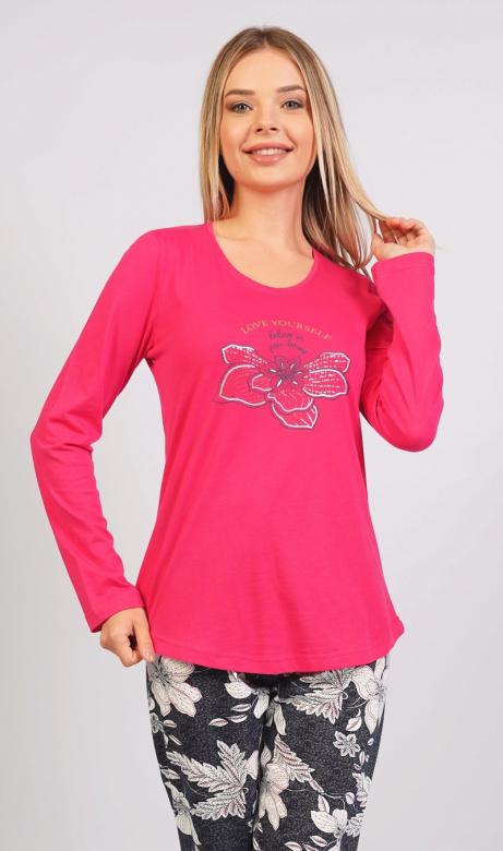 Dámské pyžamo má triko s dlouhým rukávem a motivem květiny, kalhoty jsou dlouhé s celopotiskem.