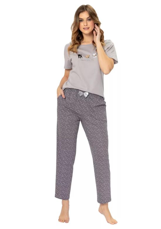 Dámské pyžamo Domenica 1325 LEVEZA je ideální volbou pro pohodlné večery i klidný spánek. Tričko s krátkým rukávem je v jednobarevném provedení a zdobí jej roztomilý motiv psů s nápisem „happy lazy day“, který dodává modelu hravý vzhled. Kalhoty jsou dlouhé a vzorované bílými puntíky, doplněné praktickými kapsami a volnou gumou v pase pro dokonalý komfort. Materiál: Pyžamo je vyrobeno ze 100% kvalitní bavlny, která zajišťuje příjemný a měkký pocit na pokožce. Tento set představuje nejen styl, ale i maxim…