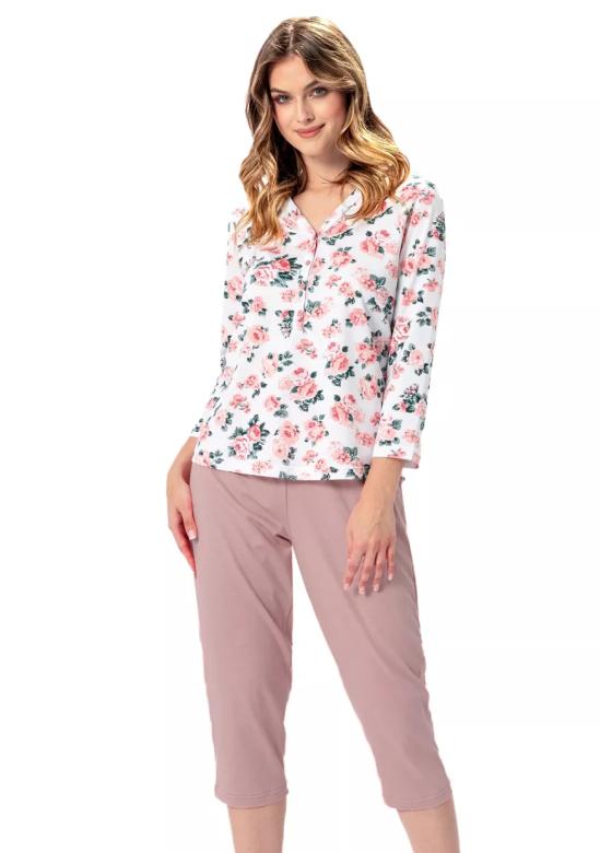 Dámské pyžamo Dori 1349 LEVEZA je ideální volbou pro pohodlné večery i klidný spánek. Halenka je zdobená jemným květinovým vzorem, který příjemně oživí váš noční outfit. Véčkový výstřih