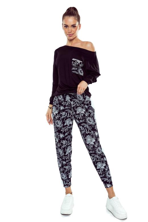 Černé tričko je s dlouhými rukávy a dlouhé vzorované kalhoty jsou zakončené manžetou.