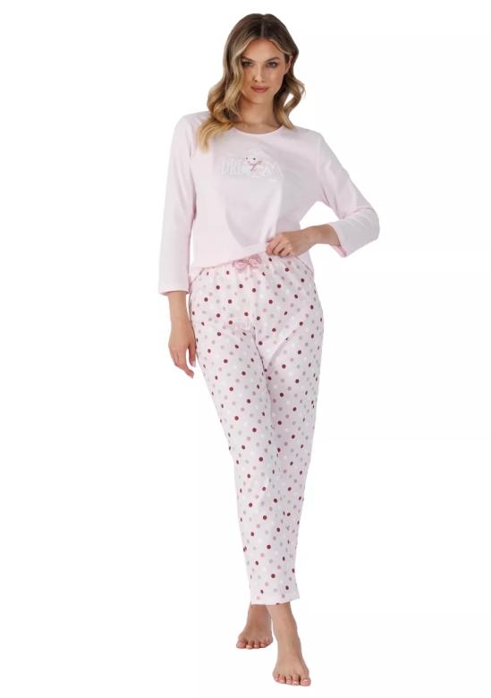 dámské pyžamo Enea 1495 značky LEVEZA představuje dokonalou volbu pro ženy, které si chtějí dopřát pohodlí a styl během odpočinku. Horní díl v jemné pastelově růžové barvě s dlouhými rukávy a uvolněným střihem Vás zahalí do pocitu lehkosti. Roztomilý obrázek ovečky na přední straně dodává hravý nádech. Spodní díl v bílé barvě je ozdobený veselým potiskem drobných puntíků, což vytváří příjemný kontrast k jednoduchému hornímu dílu.
