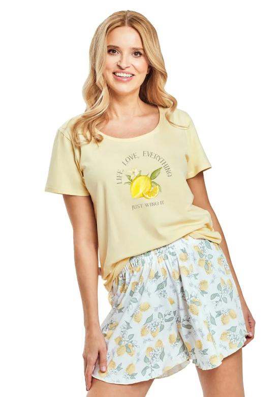 Dámské pyžamo Frida 3531 značky TARO je dokonalou volbou pro ženy, které si chtějí dopřát pohodlí a styl během odpočinku. Horní díl v jemném citronově žlutém odstínu přináší svěží energii do každého večera. Grafický potisk s nápisy „HOW OLD WAS THE“ a ilustrací citronu působí hravě i elegantně zároveň. Volný střih s kulatým výstřihem zajišťuje maximální komfort při spaní i domácím lenošení.