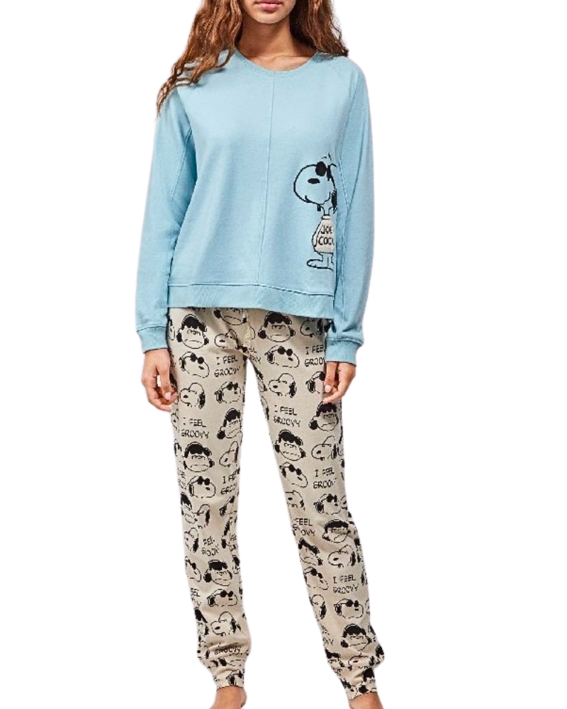 Dámské pyžamo má mikinu s dlouhým rukávem v jemném modrém odstínu s nášivkou Snoopyho – vhodné nejen na spaní, ale i na běžné nošení.