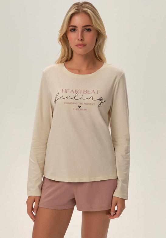 Dámské pyžamo od značky Henderson. Vrchní díl pyžama má dlouhý rukáv, kulatý výstřih a potisk uprostřed. Šortky jsou jednobarevné, bez kapes a v pase mají pohodlnou pružnou gumu se šňůrkou. Pyžamo je ušité z lehké příjemné bavlny.