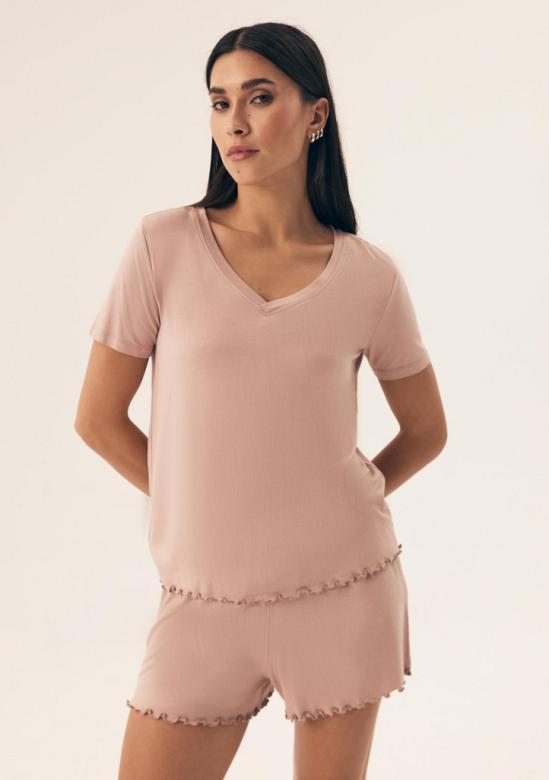 Dámské pyžamo od značky Henderson je skvělou volbou pro pohodlný spánek i domácí lenošení. Pyžamo se skládá z trička s krátkým rukávem a výstřihem do V a šortek, které jsou v pase na širokou pružnou gumu pro maximální komfort. Spodní lem trička i nohaviček šortek je ozdoben jemným vlnkovaným zakončením, které dodává celému kompletu ženský a elegantní vzhled. Díky příjemnému materiálu je pyžamo měkké a pohodlné na nošení.
