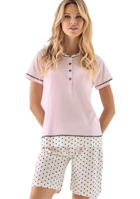 dámské pyžamo Infiore spojuje pohodlí s hravým stylem. Horní díl v jemném růžovém odstínu zdobí drobné knoflíčky a kontrastní lemování, které mu dodává originální nádech. Krátké kalhoty s černými puntíky skvěle ladí s horním dílem a zajišťují maximální volnost pohybu. Příjemný a prodyšný materiál vám poskytne pohodlí během spánku i při domácím lenošení. Oživte svůj noční šatník tímto stylovým kouskem!