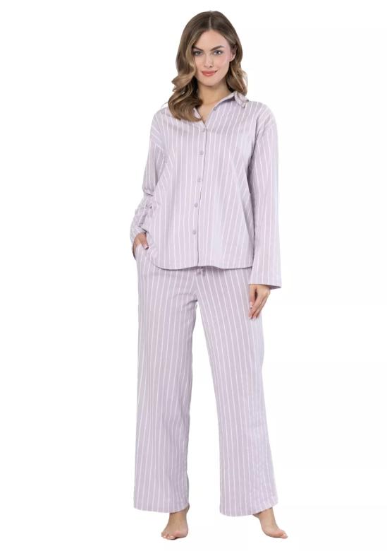 Lehké a pohodlné dámské pyžamo Judyta 1613 značky LEVEZA je navrženo pro ženy, které ocení kvalitu i styl zároveň. Komplet nabízí měkký a prodyšný materiál z stoprocentní bavlny, který jemně hladí pokožku a zaručuje příjemný pocit během celého dne i noci. Moderní proužkovaný vzor v něžných fialových tónech dodává pyžamu svěží a nadčasový vzhled. Horní díl s dlouhými rukávy a zapínáním na knoflíky je doplněn límečkem pro elegantní, přesto uvolněný dojem. Kalhoty jsou široké a dlouhé, takže pohodlí při odp…