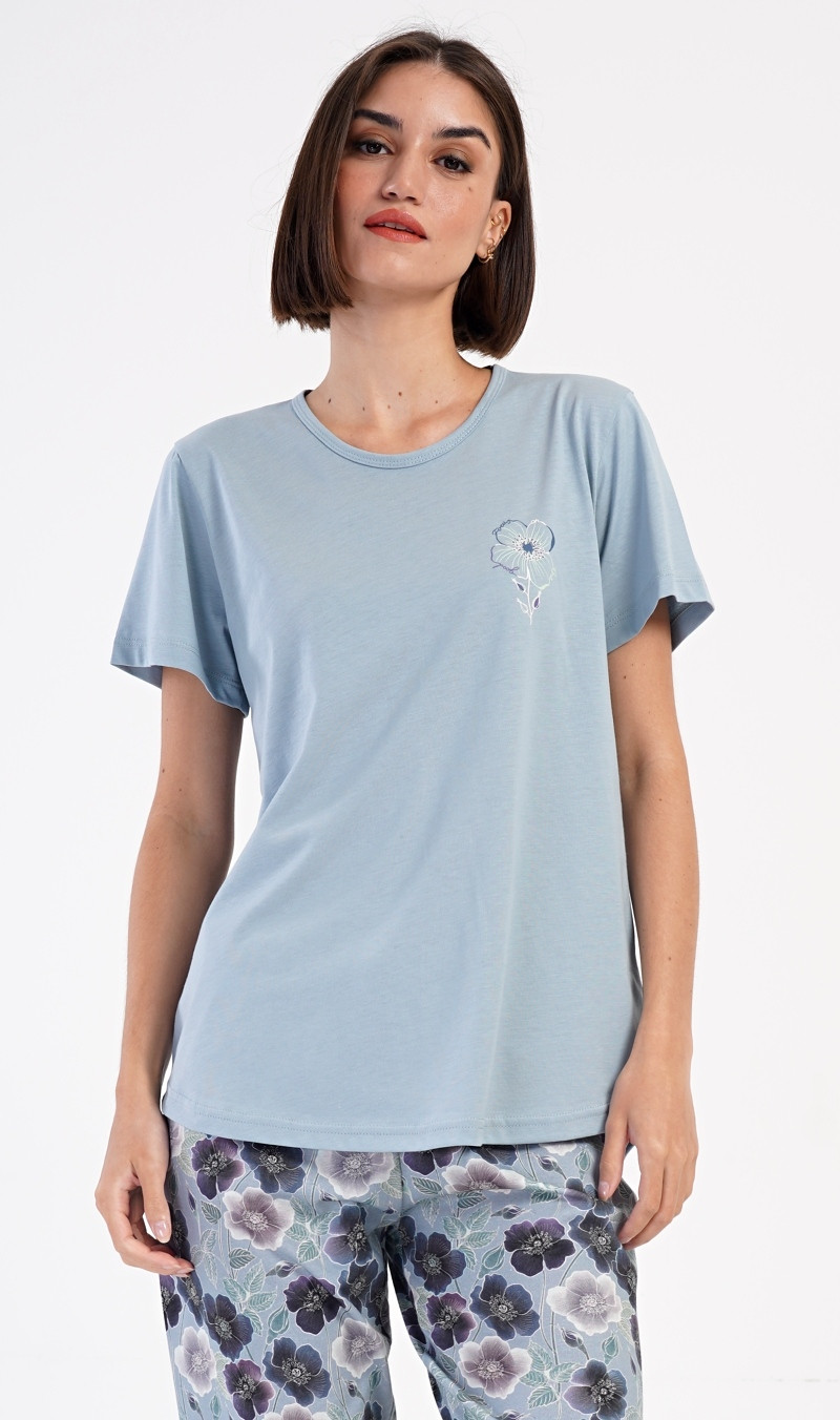 Dámské pyžamo se skládá z trička s krátkým rukávem a tříčtvrtečních kalhot.