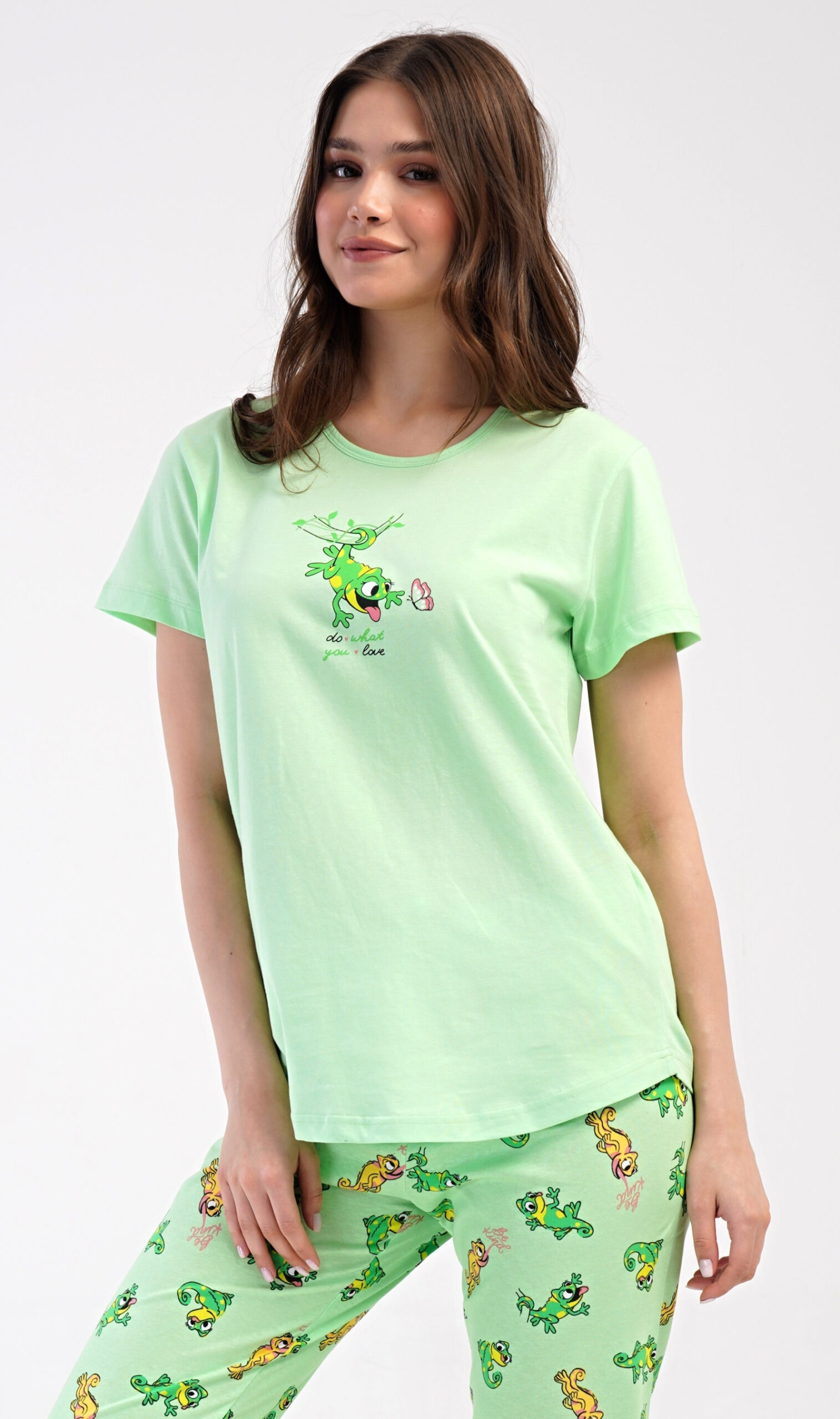 Veselé bavlněné dámské kapri pyžamo Ella s motivem ještěrky.