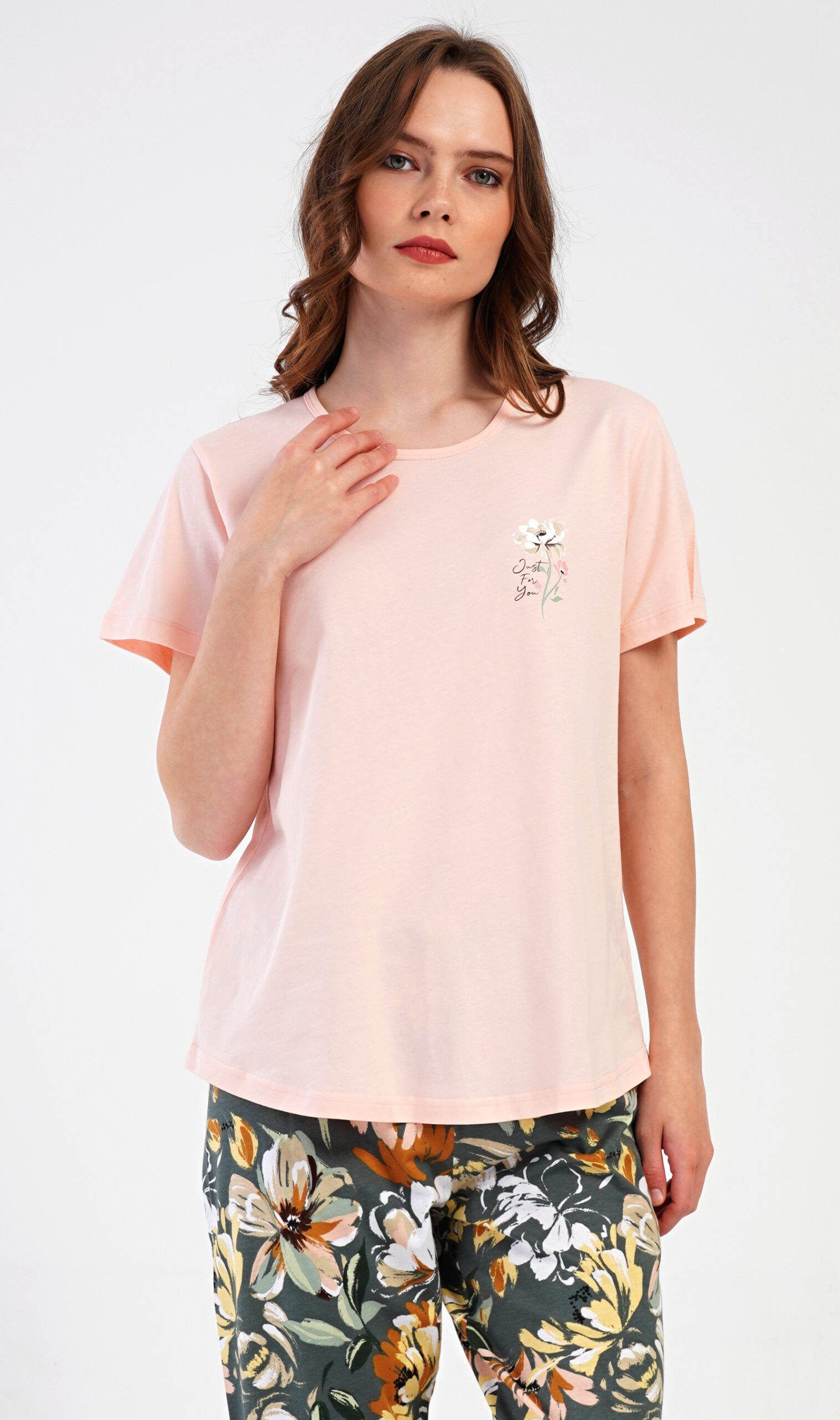 Dámské pyžamo se skládá z trička s krátkým rukávem a tříčtvrtečních kalhot.