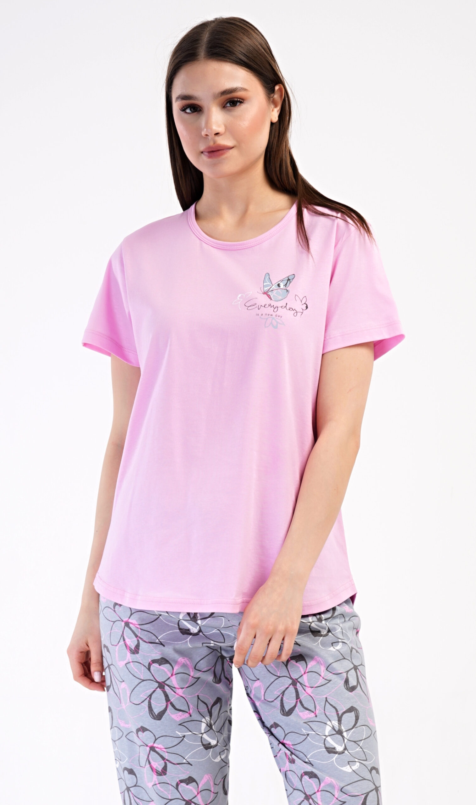 Dámské pyžamo se skládá z trička s krátkým rukávem a tříčtvrtečních kalhot.