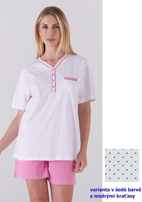 dámské pyžamo italské značky Karelpiu. Pyžamo se skládá ze dvou dílů. tričko má krátký rukáv, výstřih je mírně do „V“ a dále pokračuje léga s třemi knoflíky. Na levé straně je našitá malá kapsička. Po celé ploše je drobný potisk srdíček. Kraťasy jsou jednobarevné, v pase jsou ušité do pohodlné pružné gumy. Pyžamo je ušité z lehké příjemné bavlny, ideální na letní dny. Pyžamo je ve dvou barevných variantách. Materiálové složení: 100% bavlna